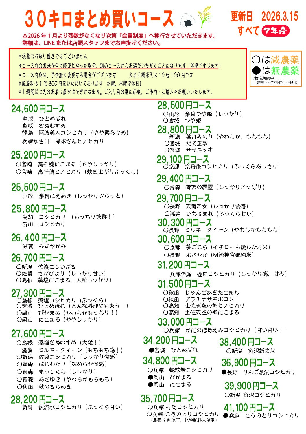 2026.3.15の最新版コース表です 【30㎏まとめ買いコースをご利用のお客様へ】 まいどです!いつもありがとうございます。 この度誠に勝手ながら、【2026年1月1日】より お米のご購入方法を一部変更させていただくこ […]